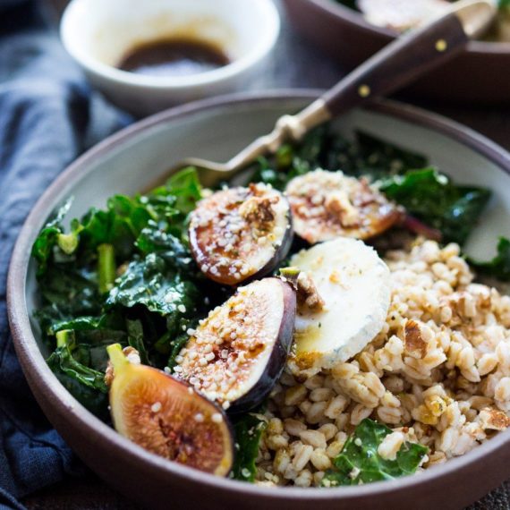 Farro Bowl with Figs, Kale & Sainte Maure Caprifeuille Goat Cheese
