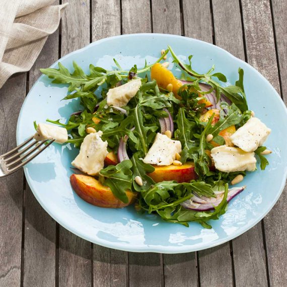 Arugula Salad with Peaches, Pine Nuts and Goat Camembert or Brie