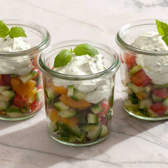 Cucumber & Tomato Chopped Salad with Basil-Fresh Goat Cheese Dressing