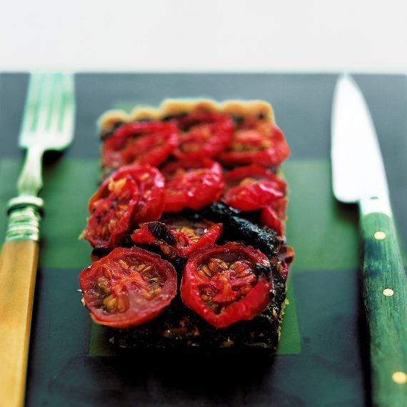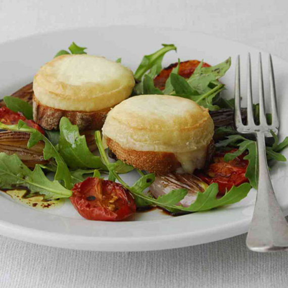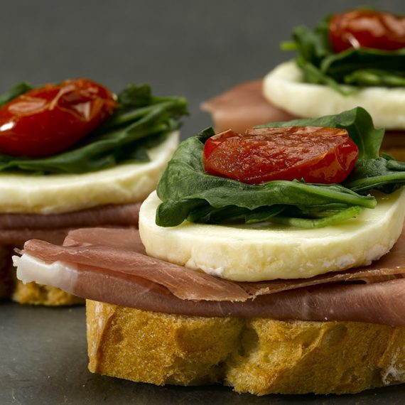 Baguette Toasts with Crottin, Prosciutto, Wilted Greens & Tomatoes